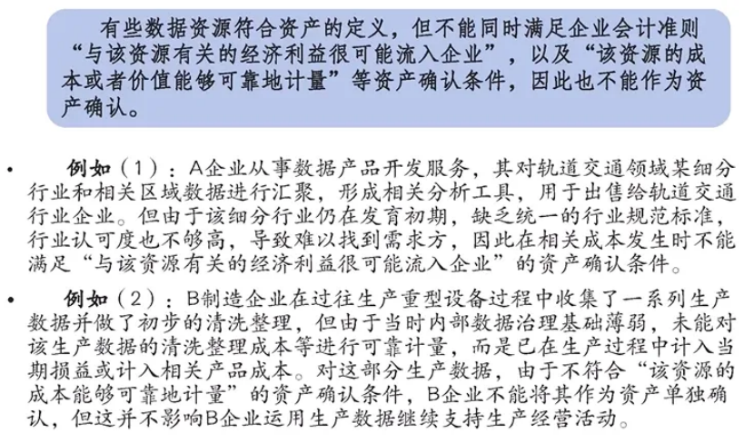 例2,B制造企業(yè)在過往生產(chǎn)重型設(shè)備的過程當(dāng)中,收集了一系列的生產(chǎn)數(shù)據(jù),并做了初步的清洗整理。但是由于在收集數(shù)據(jù),當(dāng)時(shí)企業(yè)內(nèi)部的數(shù)據(jù)治理基礎(chǔ)相對薄弱,未能對該生產(chǎn)數(shù)據(jù)的清洗整理等等成本進(jìn)行可靠的計(jì)量,而是已經(jīng)在整個(gè)設(shè)備的生產(chǎn)過程當(dāng)中計(jì)入了當(dāng)期損益或是相關(guān)產(chǎn)品成本。那么對于這一部分生產(chǎn)數(shù)據(jù),由于不符合“該資源的成本能夠可靠的計(jì)量”的資產(chǎn)確認(rèn)條件,B企業(yè)并不能夠?qū)⑵渥鳛橘Y產(chǎn)去單獨(dú)確認(rèn),但是這并不影響B(tài)企業(yè)運(yùn)用生產(chǎn)數(shù)據(jù)繼續(xù)去支持它自己的生產(chǎn)經(jīng)營活動。